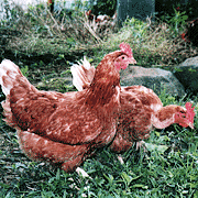 (ニワトリ) 鶏は全部で14羽。昼の間は放し飼いなので、アイランド内を勝手気ままにつつきまわっている。14羽のうち3羽だけがチャボで、オスが1羽のハーレム状態。彼は最近やたらと交尾をしていて(一瞬で終わる)、時として人間をライバルとみなすのか、首の下の白い羽根を大きく広げて向かってくることがある。たかが鶏と思って油断はできない。 |