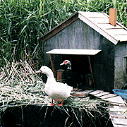 (アヒルとフランス鴨) アヒルは素晴しくきれいだ。黒いガラスのような眼に真っ白な透き通るような羽。西日に浮かぶ彼女のシルエットはとてもロマンチック。でも本当はロンリーガール。最初はつがいでアイランドへやってきたのだけれど、ある朝、オスは忽然と消えてしまっていた。隣のおばさんに聞いたところ「きのう牧場からキツネが白いものをくわえてくるのを見た人がいるよ。キツネも今、子育ての時期だからねえ」と話してくれた。その池に、今度はフランス鴨も仲間入りをした。 |