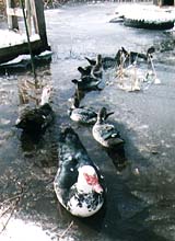 アヒルは「ガー、ガー」うるさく鳴く。「腹減った」「オスがのっかってきた」「おじさん(僕のこと)が怒ってる〜」「もっと早起きしろ」。フランス鴨はほとんど鳴かない。でも時々向かい合って口をパクパクさせているのは、きっと人間に聞こえない声で、人に聞かれたくない話をしているのだろう。 |
