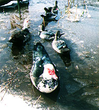 冬は平飼いのニワトリやアヒルなど家禽類にとって受難の季節である。アイランドに6羽いるフランス鴨にもその季節がやってきた。暖かい季節は、池の中央にある中州に小屋があって、夜の間そこにいる限りキツネやイタチから身を守ることができる。それでも池の周りにうっそうと茂った花の影に隠れて忍び寄り、明け方、陸に上がってくるのを狙い襲う。 群のボスがみんなを守る為に最初に立ち向かうのだろう、決まってボスが先にやられる。今シーズンは8月末に大ボスがやられ、その他のも2羽やられた。せっかく生まれた5羽のヒナも2羽しか残らず、今の数になってしまった。