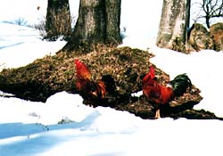 タダでさえこの通り、これが冬になり、池の水が凍ってしまうとさらに危険がます。氷上を渡って簡単に小屋に近づくことができるからである。ただし、彼らにもハンディが生まれる。枯野となった池の周りに身を隠すところがなく、雪が積もれば足跡も残るからである。 冬は極力夕方には陸上にある小屋に入れて戸を閉めておくのだが、油断は禁物。吹雪の後や、モヤがかかったような日に彼らはやってくる。彼らだって生きていかなければならない。だから、やられたときは自然の摂理と受けとめ彼らをあまり憎んだりしない。エサの確保の為に彼らは絶対に全滅させないし、子を増やすメスをきちんと残す。無節操に資源を食い潰す人間のことを思えば、彼らを無闇に責めることができないのだ。 |