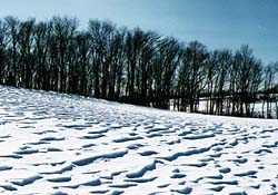 | ガーデン一面を覆っていた雪が春の兆しと共に消え、土が顔を出し、確実に春が近づいているのを感じる。しかし春とは言え外ではまだまだ寒く、木々の芽は堅くハーブの芽も動いている気配すらない。これが4月の声を聞く頃ともなると、いっせいに確実に、静かに目覚める様を見る事になる。毎年繰り返している事ながら何度経験しても自然の不思議な力強さを感じる瞬間だ。 この春は40〜50種類のオールドローズを植えようと考えている。2〜3年もすれば、フロム蔵王の自然に溶け込むのではないかと期待している。また「小さい森」づくりも引き続き進め、先駆樹と考えているアカシアと針葉樹、照葉樹それに下草とで構成し、いずれは森と森をつなぎ安定した森環境にしたいと考えている。 |