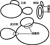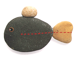川原に行った時に拾った3個の石で、魚をつくりました。水の流れで角が丸くなった石の方が、魚の材料にはいいようです。アクリル絵具で目と模様をいれます。 石と石を接着するときはエポキシ系接着剤(2液混合タイプ−5分型など)が最適で、見えない部分を多めに盛り上げて接着します。 |