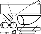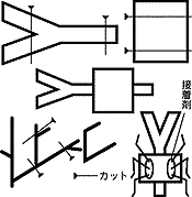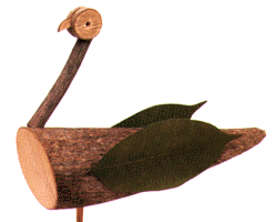 木の枝を斜めに切ると、切り口はだ円形になります。太い枝や細い枝を角度を変えて、斜めに切る、または薄く切るなどして、いろいろな形をつくることができます。いくつかの太さの枝を図のように切って、押し葉の羽を付け、目を描いてキジをつくりました。接着には木工用ボンドを使います。木の種類、太さ、切り方で変化をつけて、お好きな鳥をつくってみて下さい。 |